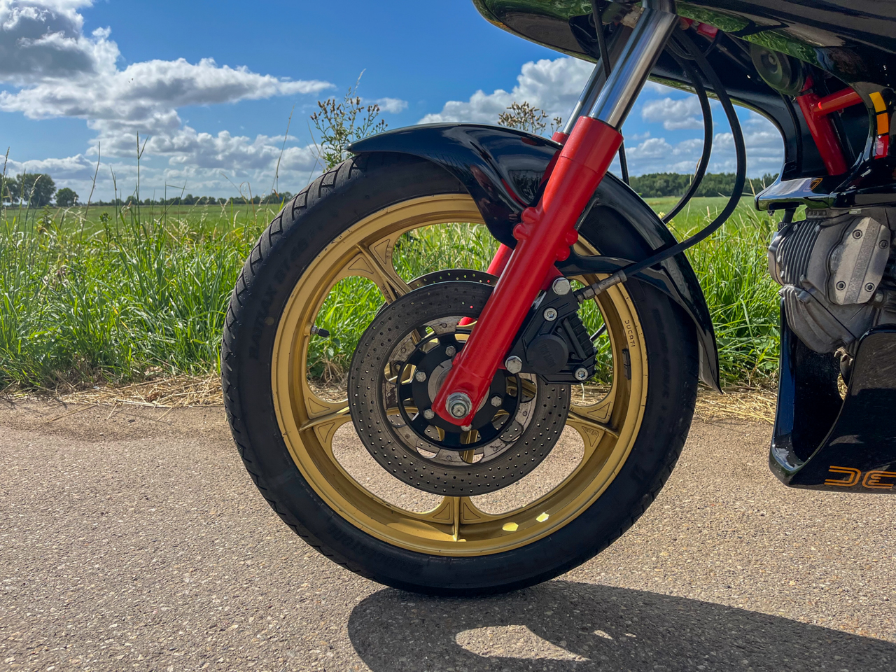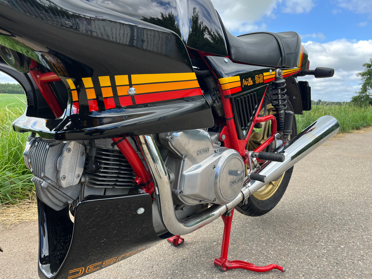 This particular Mille S2 has just 19,850 km on the odometer and is presented in exceptionally original condition. When it arrived, the bike had been repainted in red, so we took the initiative to restore the full bodywork to its correct and striking original livery: the iconic black with orange/yellow/red graphics, as it left the factory.