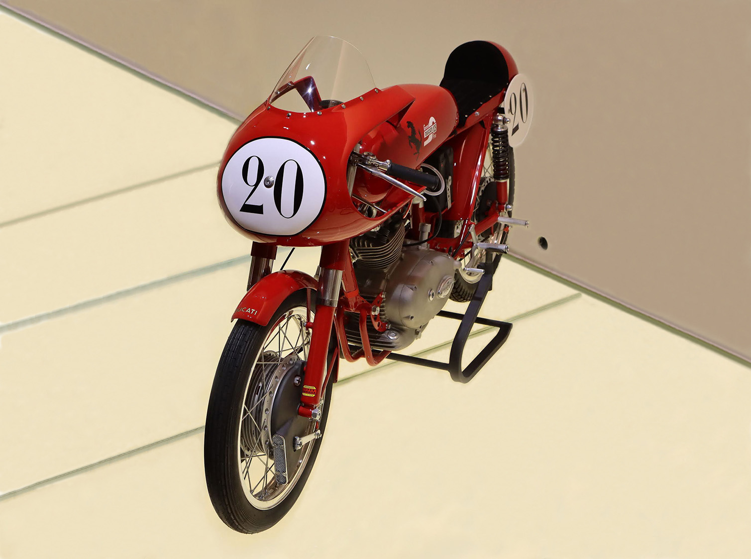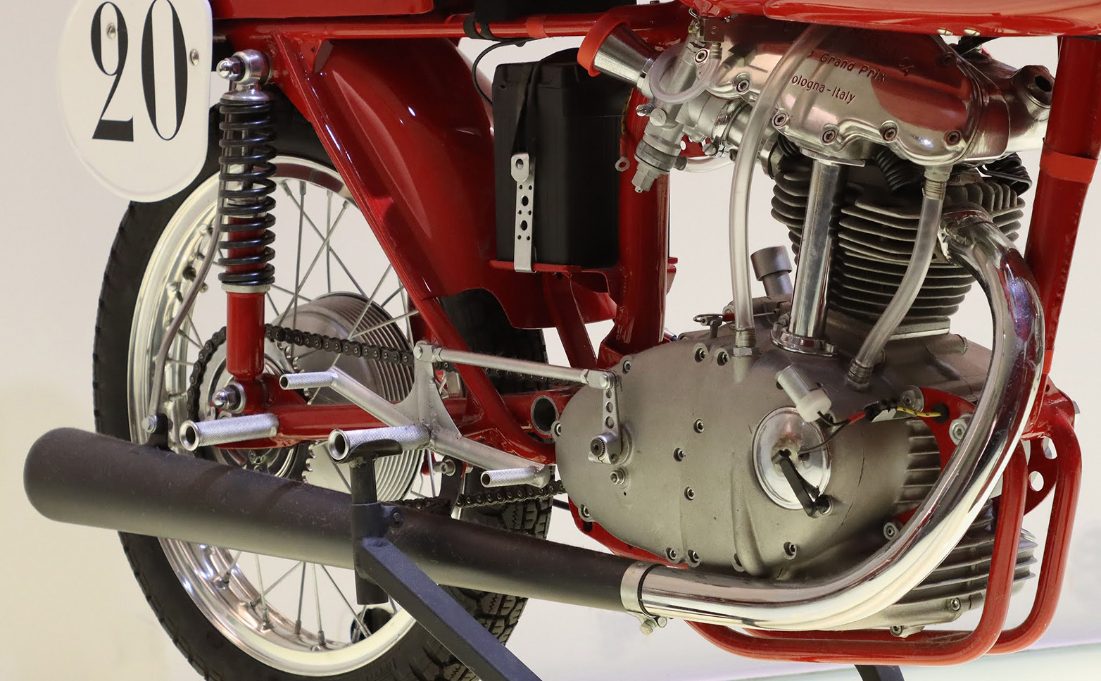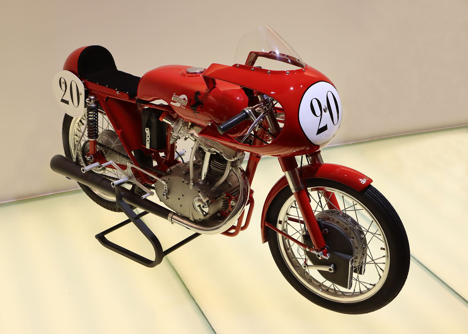 Ducati 125 Grand Prix Bialbero from 1956, driven by bevel gears inside the Ducati Museum at Borgo Panigale, Bologna (Italy). A riveting sight defining the dawn of the mythical Transalpine motorcycling firm and one of the most beautiful bikes ever made.