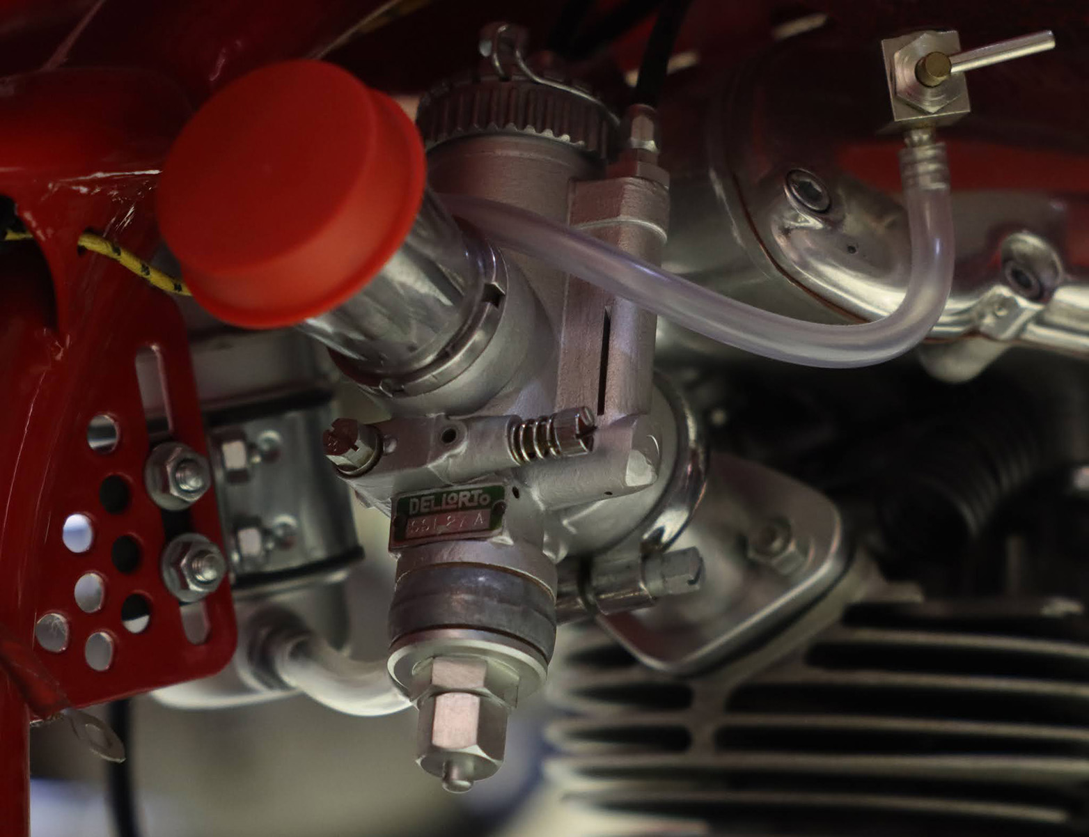 Detail of the Dell´Orto SSI 27A carb fed with gas through the tube placed in the upper central and right areas of the image, once the fuel tap (visible in the top right zone) is opened.