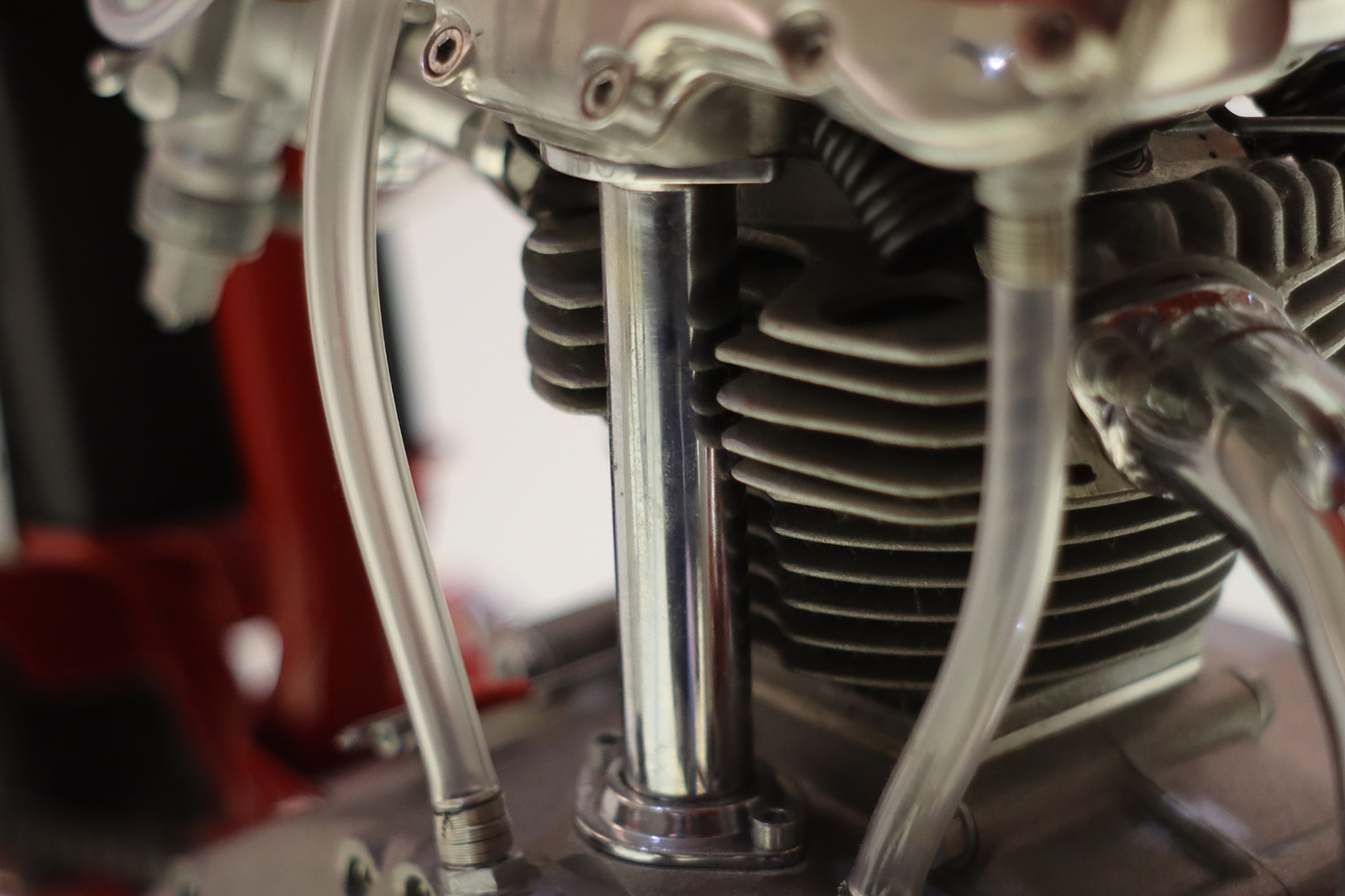 Detail of the Ducati 125 Grand Prix cylinder. In front of it can be seen the large metallic tube inside which is the main shaft with double overhead camshaft and two bevel pinions turning the vertical movement into horizontal one.
