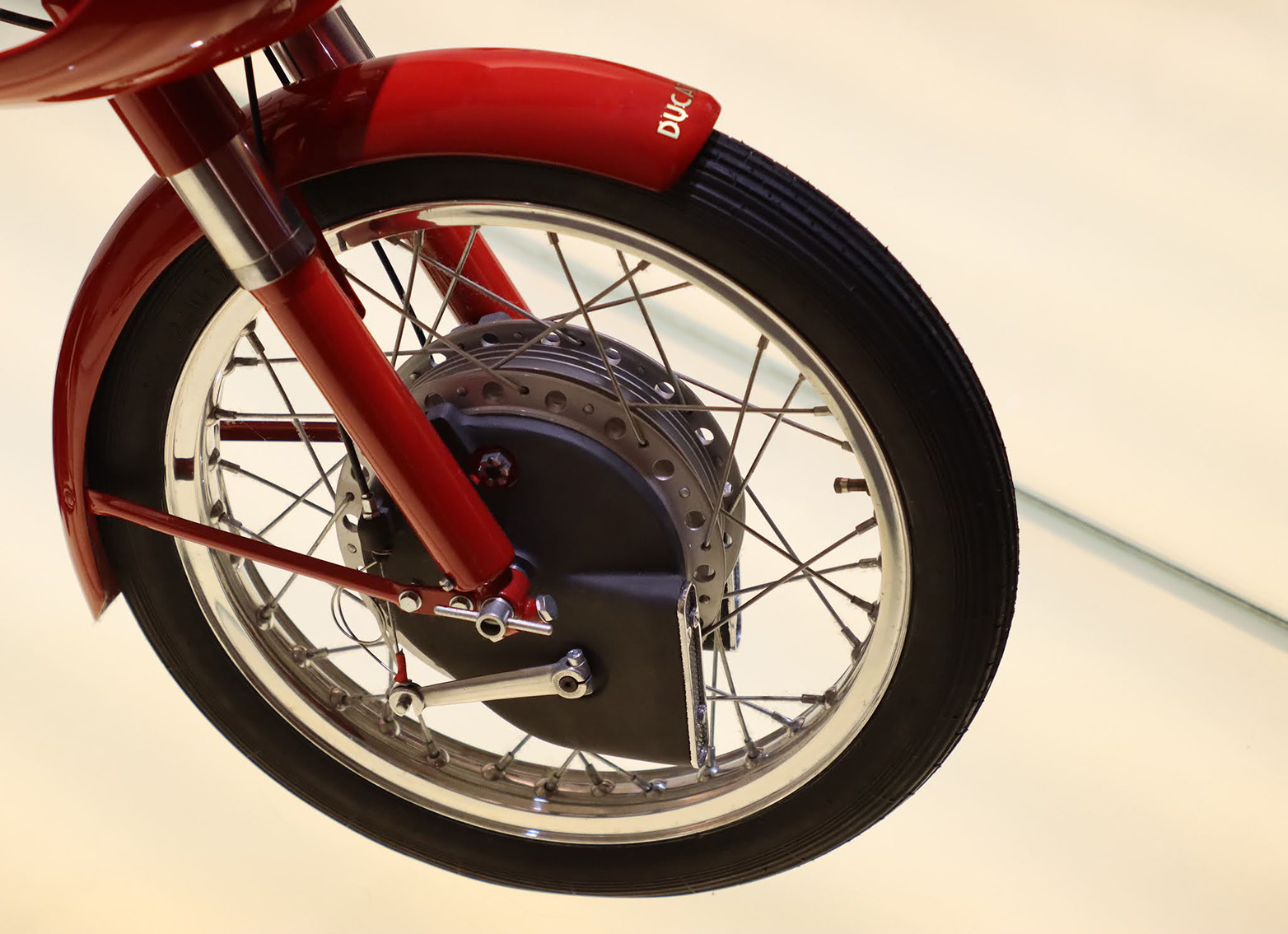 Front wheel of the Ducati 125 Grand Prix, showing the telescopic forks, the black colour cover of the drum brake and the very magnesium Amadori front and rear drum brake (incorporating a cam) just beyond it. This kind of brake has a very large surface of contact, so the chromed opening in both brake covers lets the air enter to cool the whole braking system.