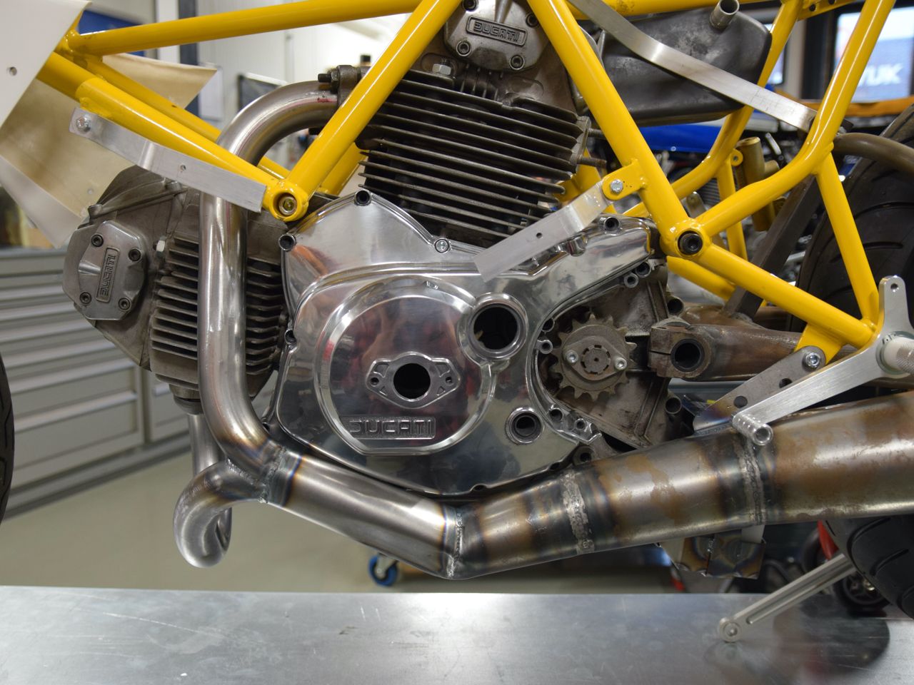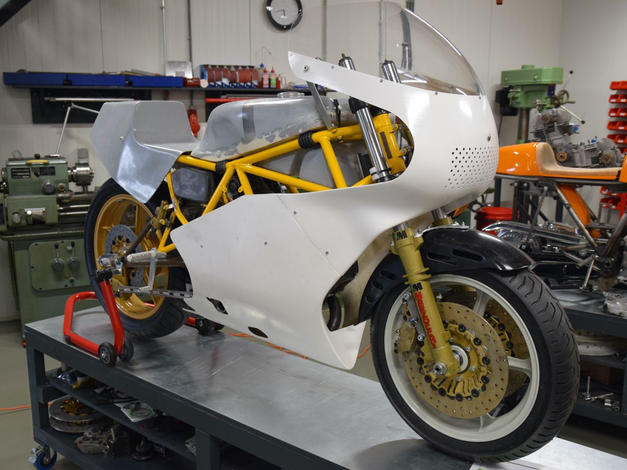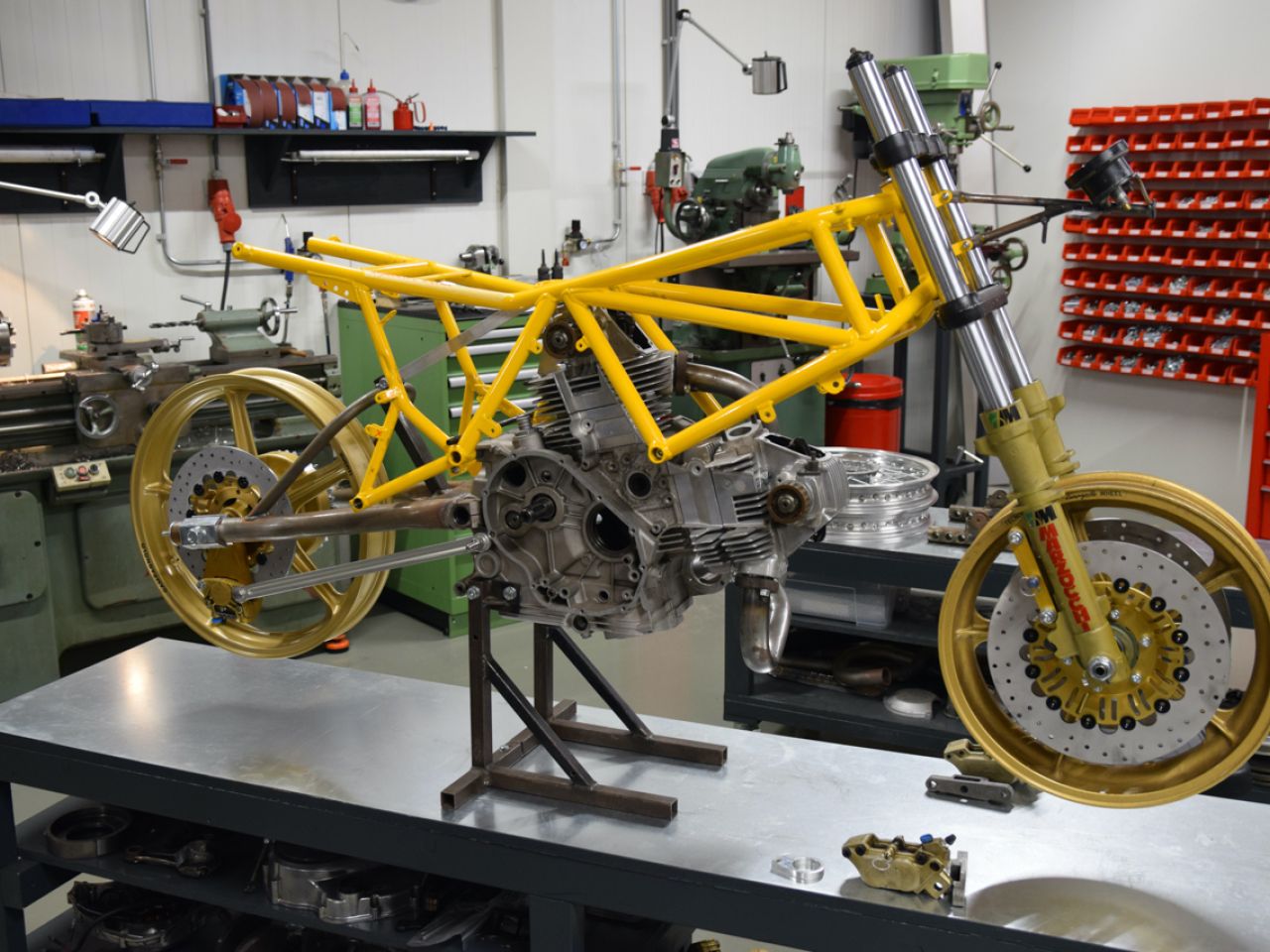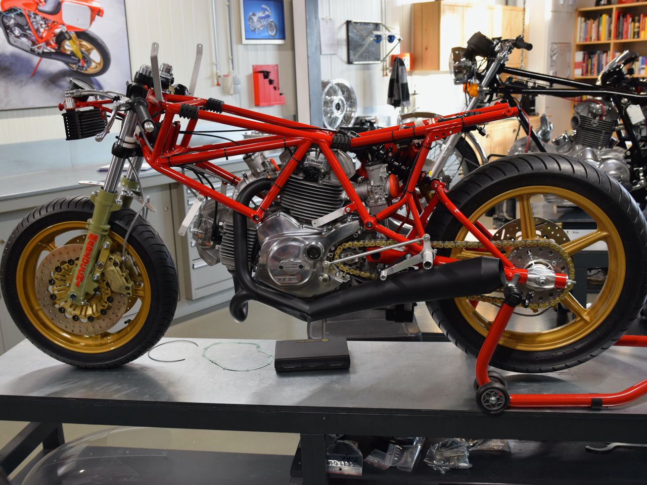 After a few months of searching, we had most of the parts on the work bench to start the build. We had two 600cc Pantah engines in stock: one was used to construct the rolling chassis while the other one formed the basis for the actual racing engine. The rolling chassis was first completely constructed.