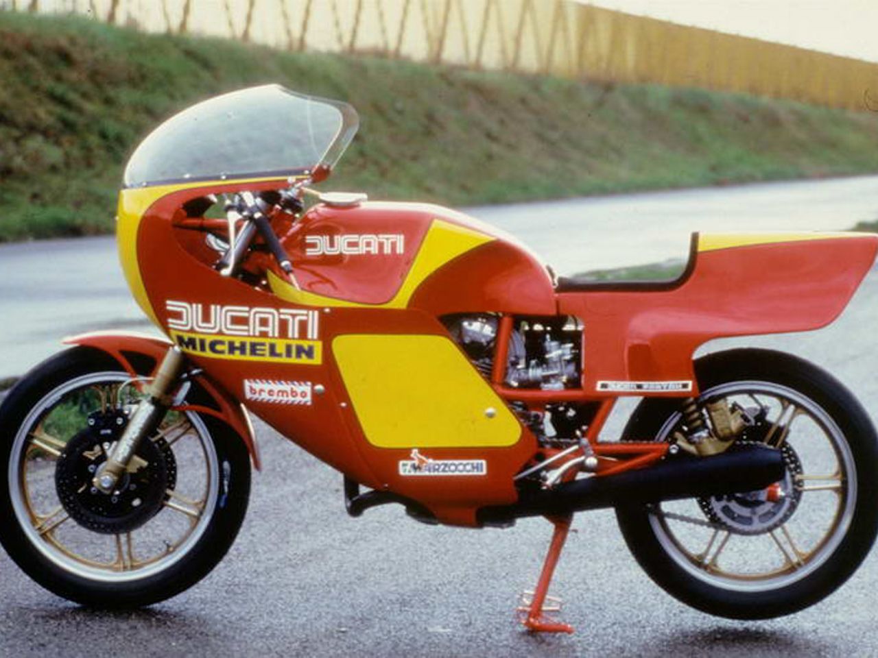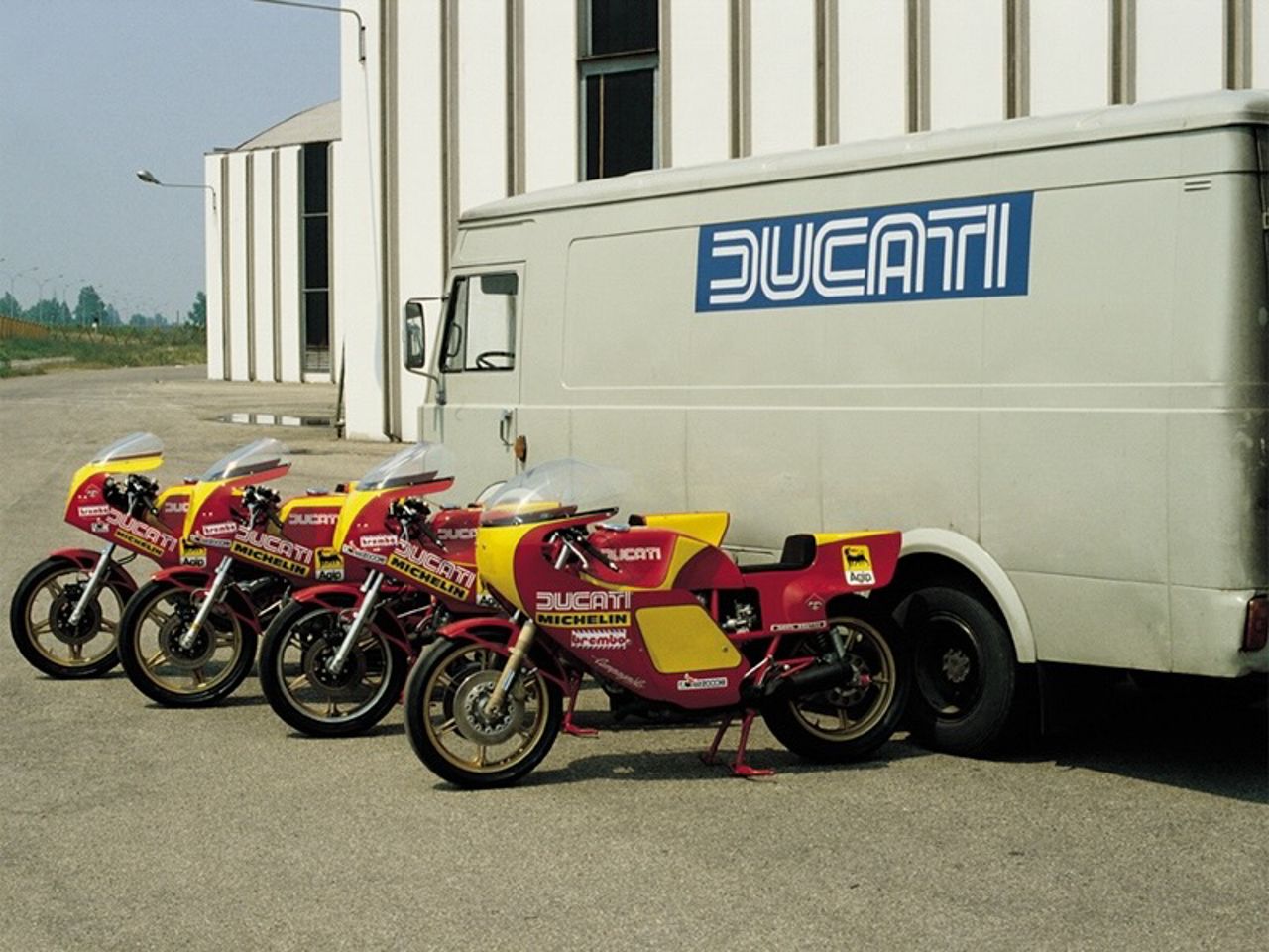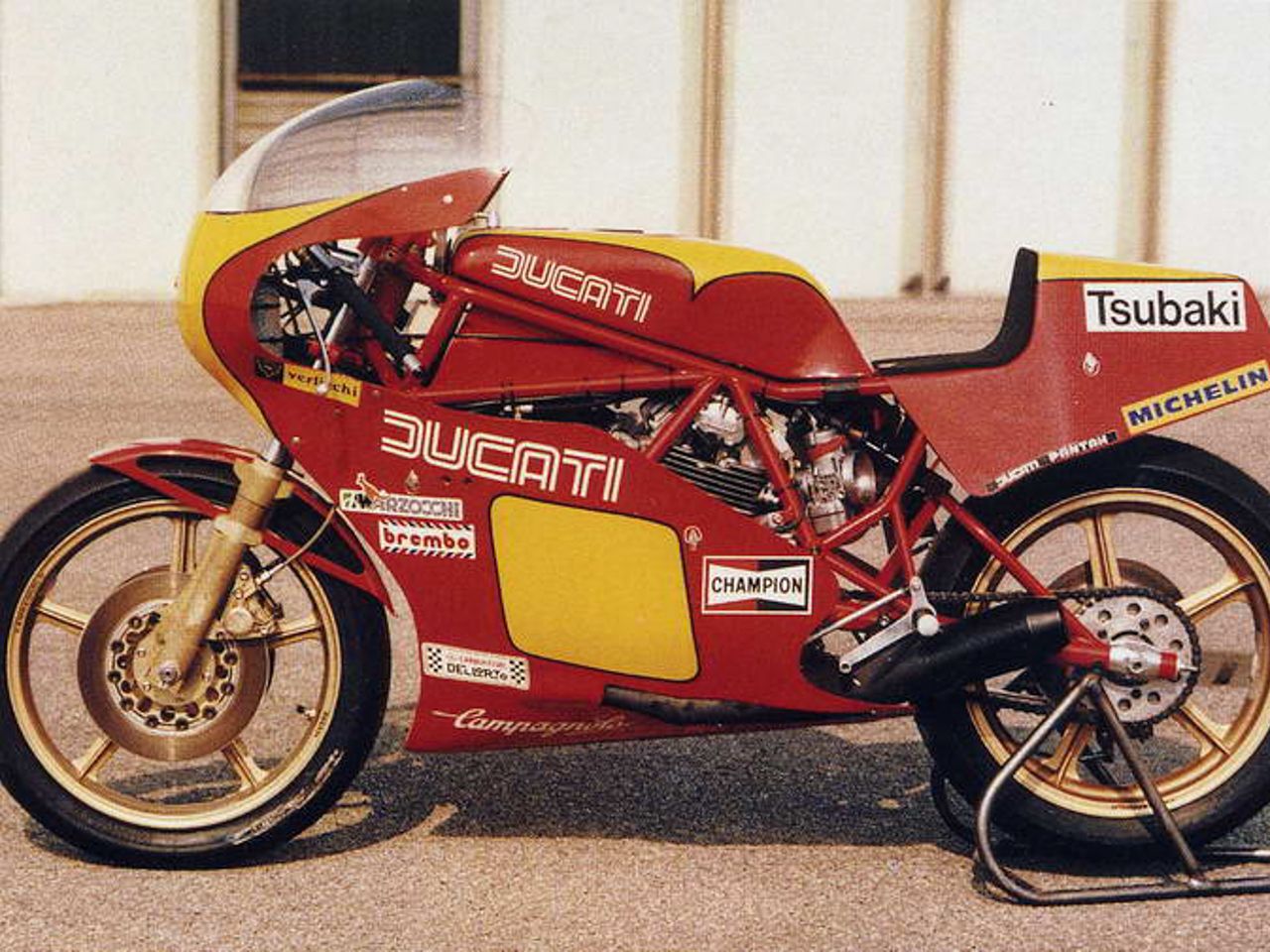 A 1981 Ducati TT2 works racing bike with the Borgo Panigale factory buildings in the background.
