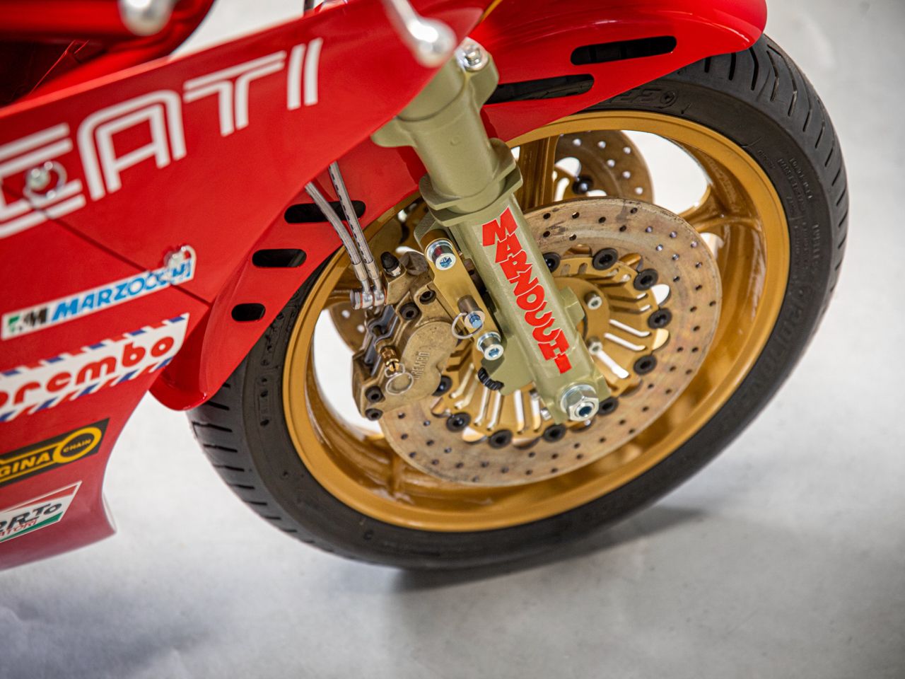 The truly spectacular development was the bike’s rolling chassis: Verlicchi created a very narrow and strong trellis frame using chrome-moly tubing and weighing only 8kg. It fitted so tight around the engine that the cam belts had to be exposed. A Paioli mono-shock connected the triangular steel swingarm to the frame and a fully adjustable Marzocchi front fork was fitted with magnesium fork legs. A set of 18” magnesium Campagnolo wheels with fully floating Brembo brake discs finished the racing package.