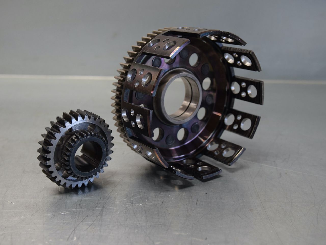 Machined clutch basket and straight-cut primary gears.