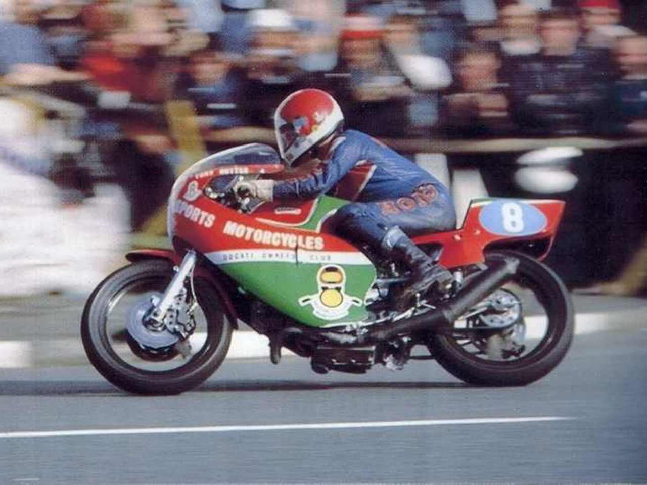 Tony Rutter in action at the 1981 TT Formula 2 race at the Isle of Man onboard the hastily constructed Sports Motorcycles 600 Pantah. He won the race despite the lack of support from Ducati who would have had a much faster bike for him!