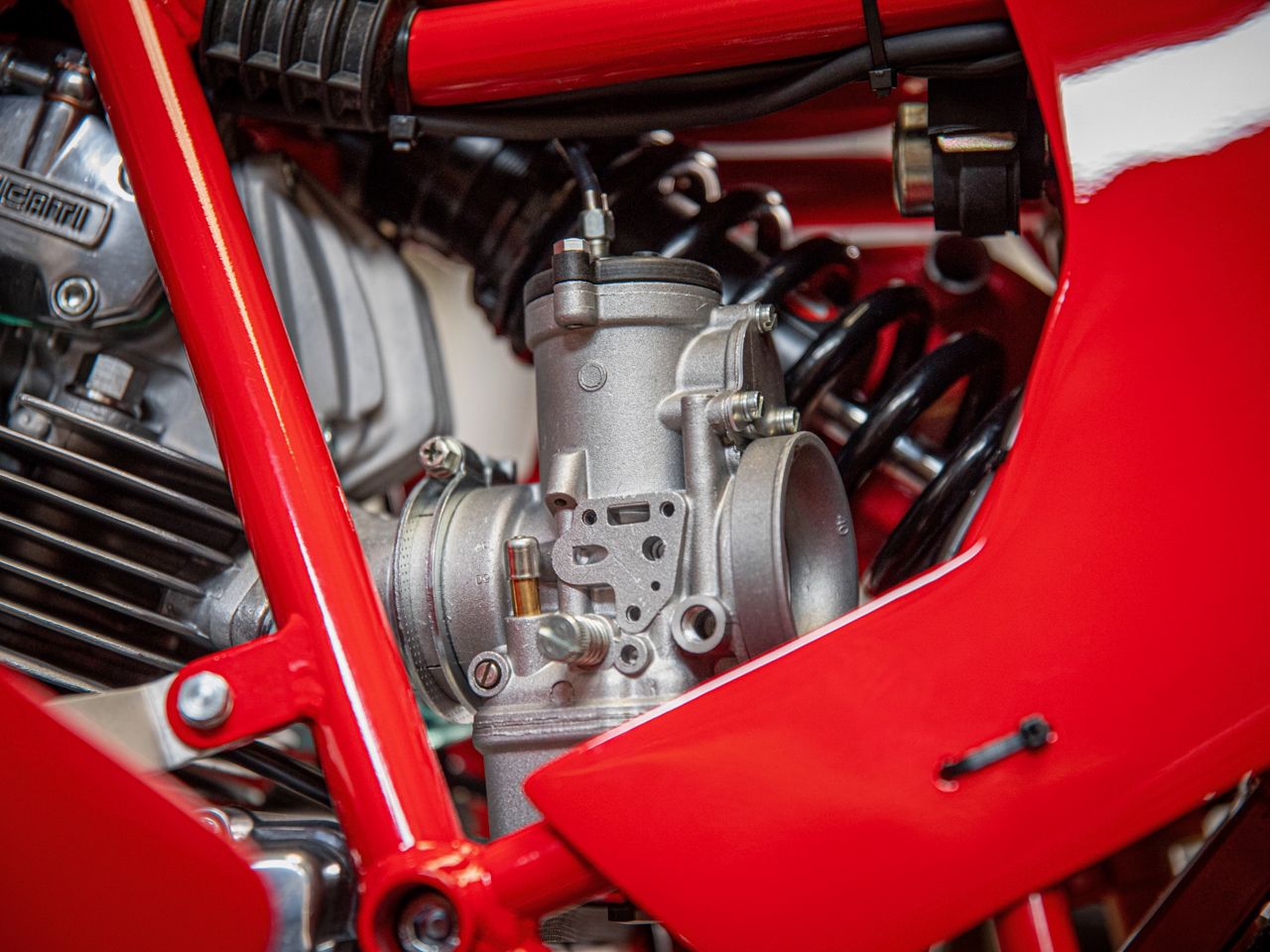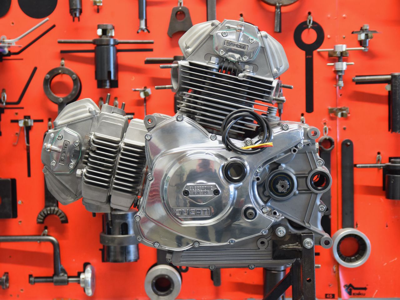 The engine’s basic layout was copied from the bevel drive twin with vertically split crankcases, a 90˚ angle, with the horizontal cylinder still inclined at an angle of 15 degrees. The design incorporated left side gearshift as a standard as well as a starter motor now located underneath the horizontal cylinder. The cylinder heads incorporated Ducati’s famous desmodromic valve actuation.