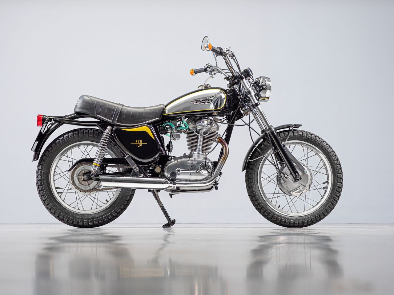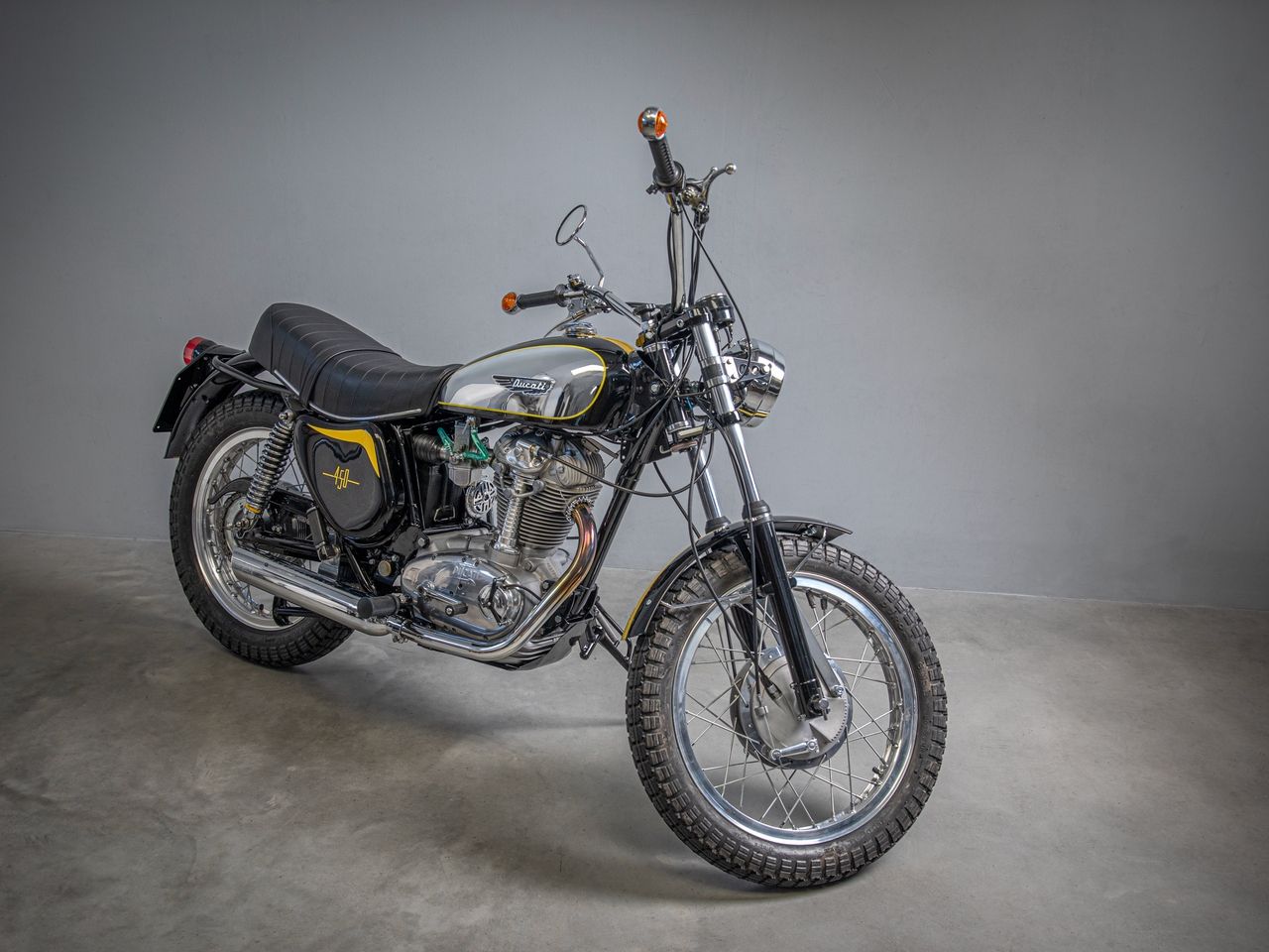 For 1969 the Scrambler family was joined by the first 450, sold in the US as the Jupiter but simply as the 450 Scrambler in the rest of the world. For 1973 the Scrambler got further updates and now included the double-sided front brakes of the Desmo models and fibreglass side covers. The recently restored 1974 450 Scrambler is one of the last to have been made before the model went out of production.