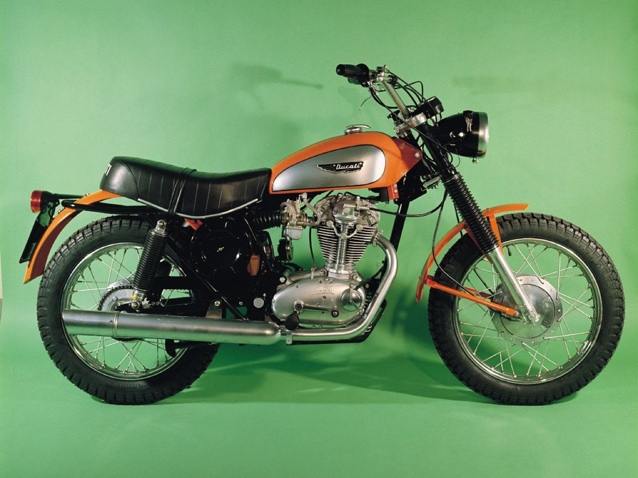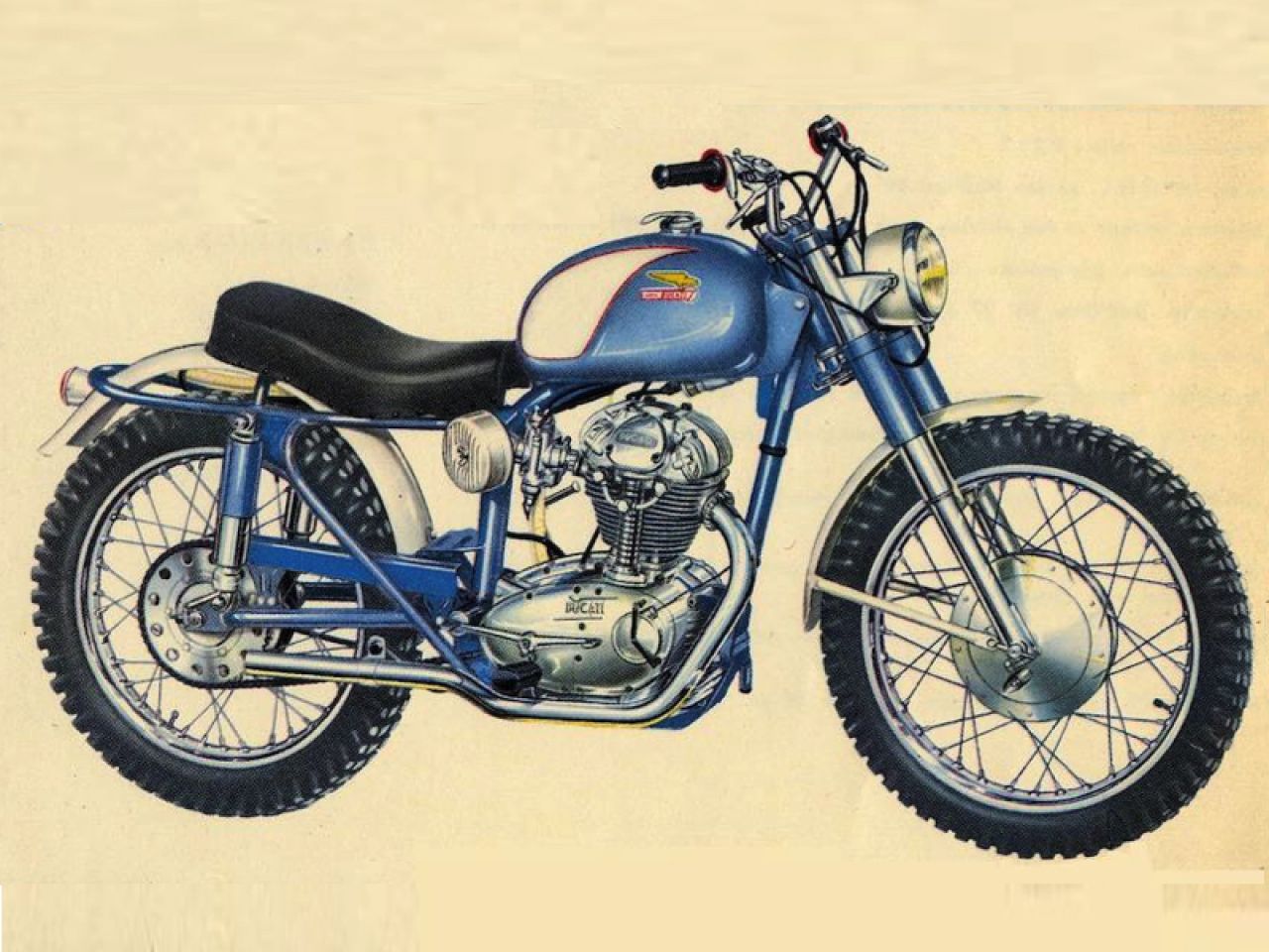In 1958 Ducati had marketed a true off-road racing model for the first time: the 175 Motocross followed a year later by a 200cc version. These Motocross models were hard core off-road bikes with a strengthened frame and swingarm and a lot of specific (and beautiful) competition components. It made these bikes quite expensive and not very appealing to the more road oriented users. Berliner asked Ducati to develop a softened-down off-road model that would be more attractive to a broader public. This became the first 250 Scrambler of 1962.