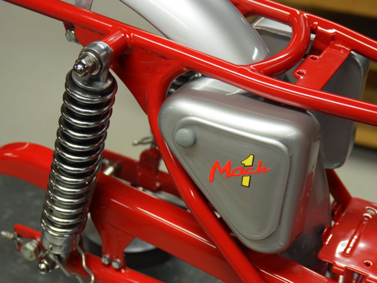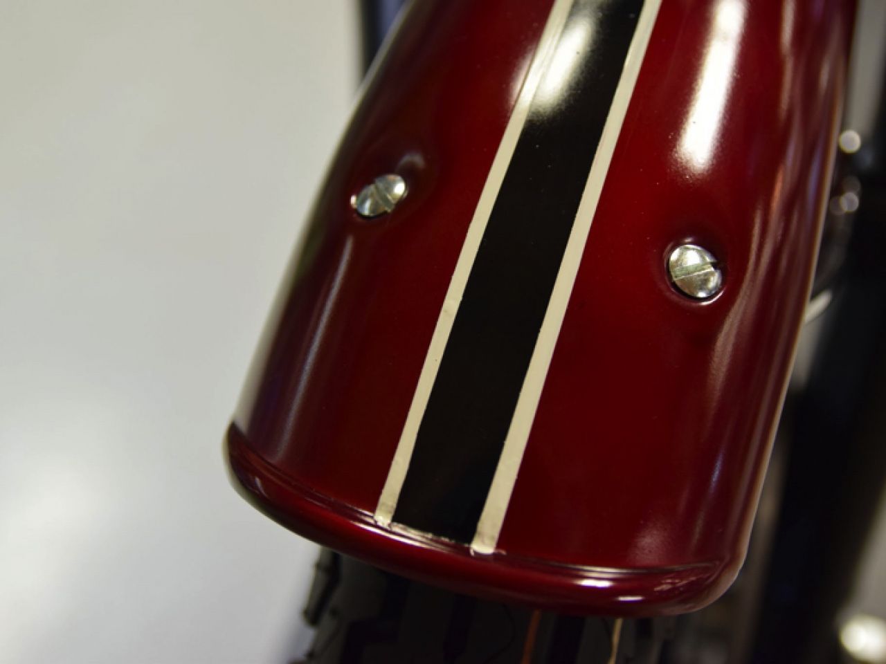 Almost all steel parts (like frames, mudguards, fuel tanks etc.) up to the 1980’s were originally painted with cellulose base paint as this was the most common paint system for cars and motorcycles. Cellulose paint can be applied under very simple conditions as it dries almost immediately. As the paint doesn’t have a natural gloss, the individual parts were polished to give it a shine. No clear coat finish was applied and decals were put directly on top of the paint after polishing.