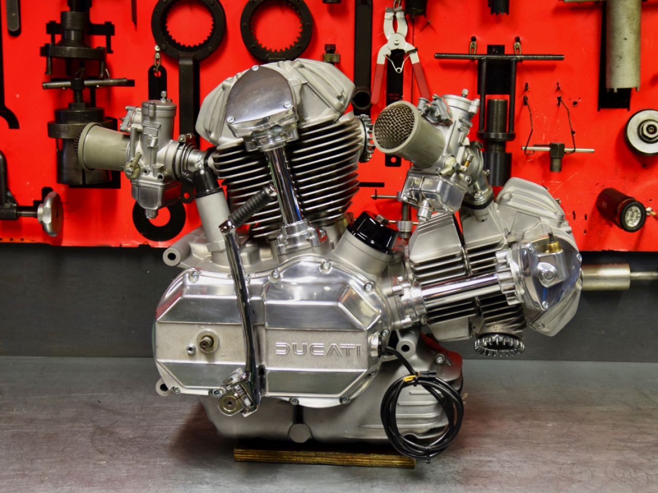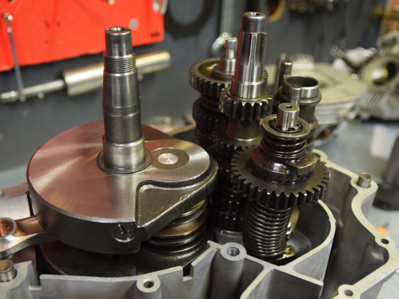 The main problem with the production of the existing 750 ‘round case’ engines was the lower distribution of the bevel drive. This consisted of a total of 5 gears driven from the crankshaft, all of which had to be shimmed exactly. And to do so, the whole set-up must be assembled, disassembled and reassembled until it is to the correct specifications. No wonder it took a skilled worker in the factory up to 10 hours to complete one single 750 engine. Taglioni cleverly designed an outer plate with bearings in which the lower distributing gears could be shimmed and fitted directly. This simplified production of the engine considerably.