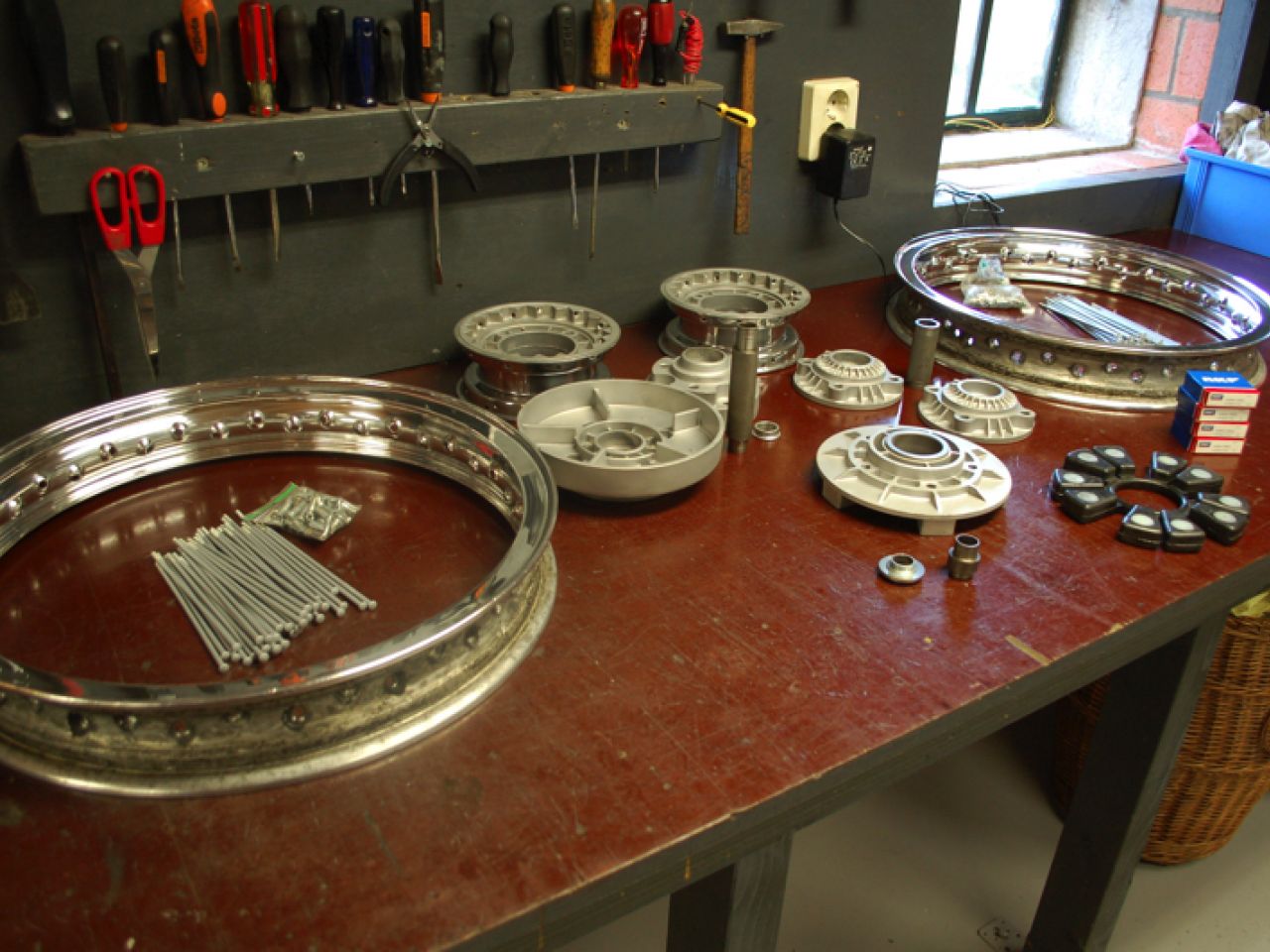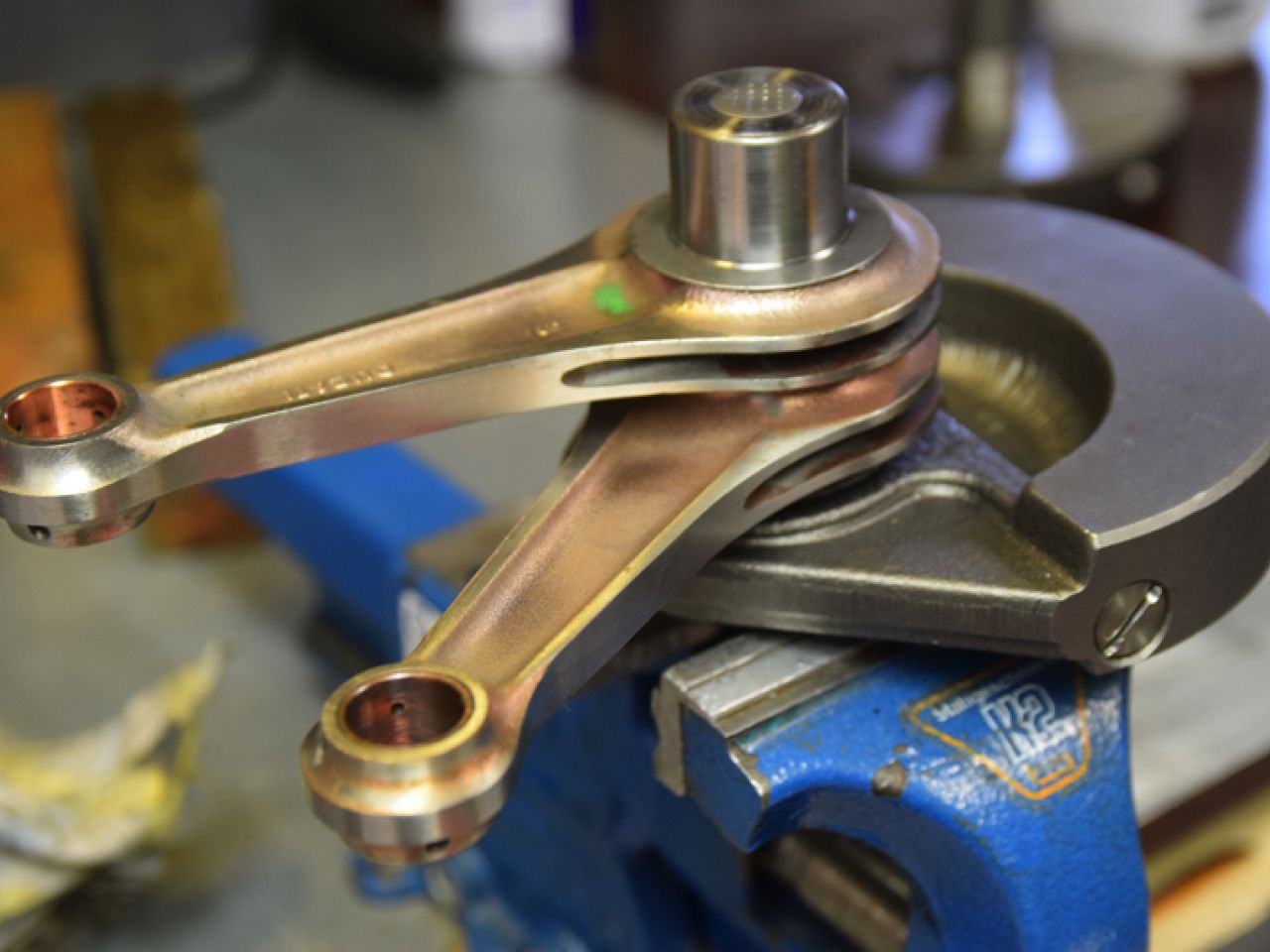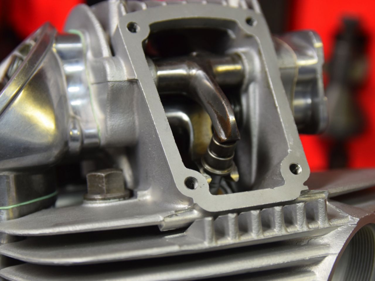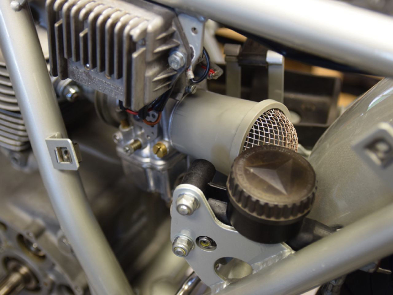 The engine was first fully rebuilt to original specifications. The original con-rods were fitted with a new oversize pin and standard roller bearings. The gearbox was refurbished and a NOS set of Borgo pistons was bored and honed to newly lined cylinders. The cylinder heads were rebuilt with new valves and guides and the original polished rockers. The complete engine was assembled after all the parts were cleaned, blasted and polished.